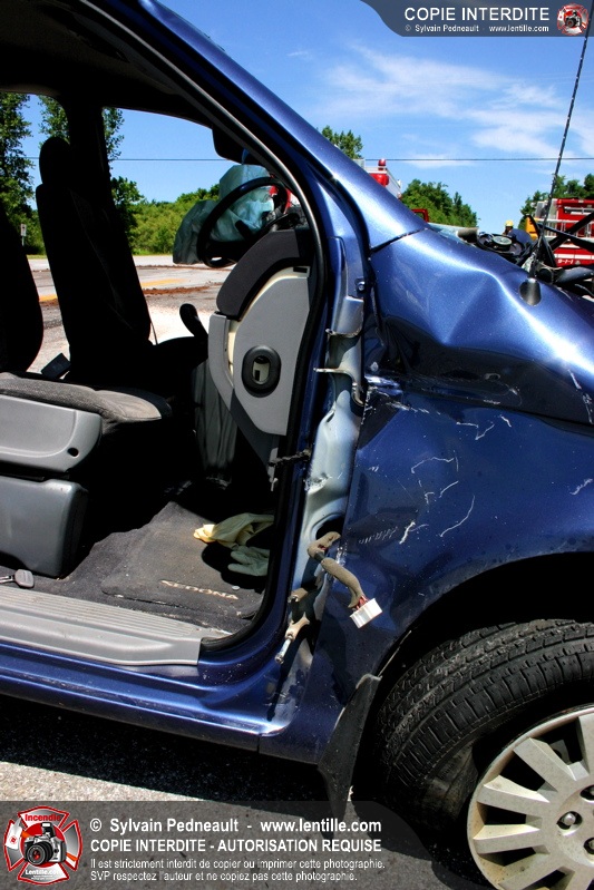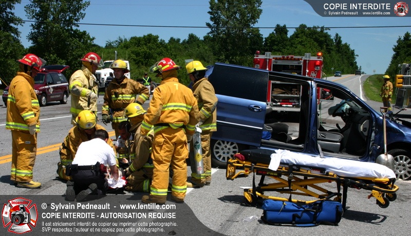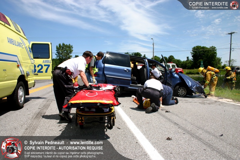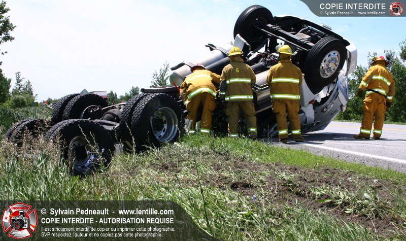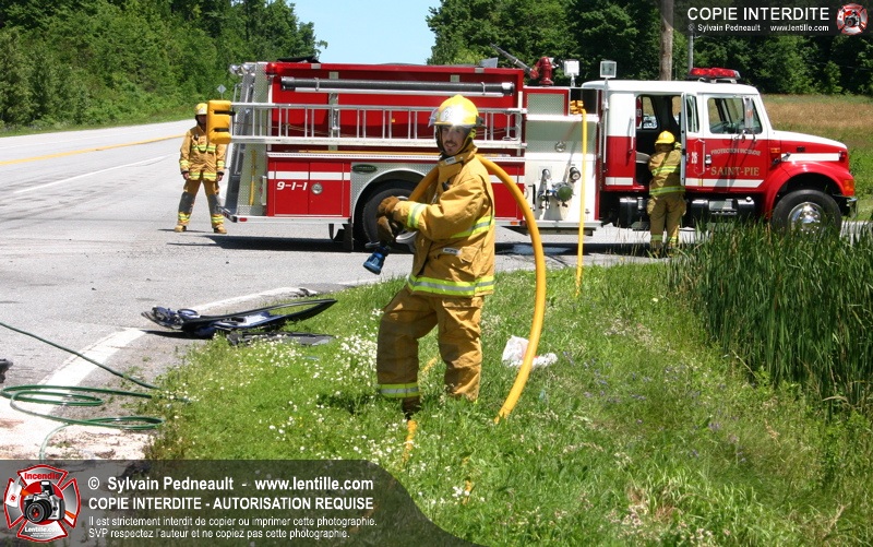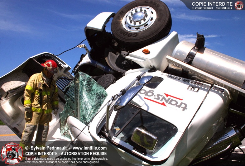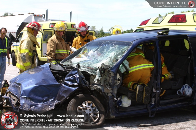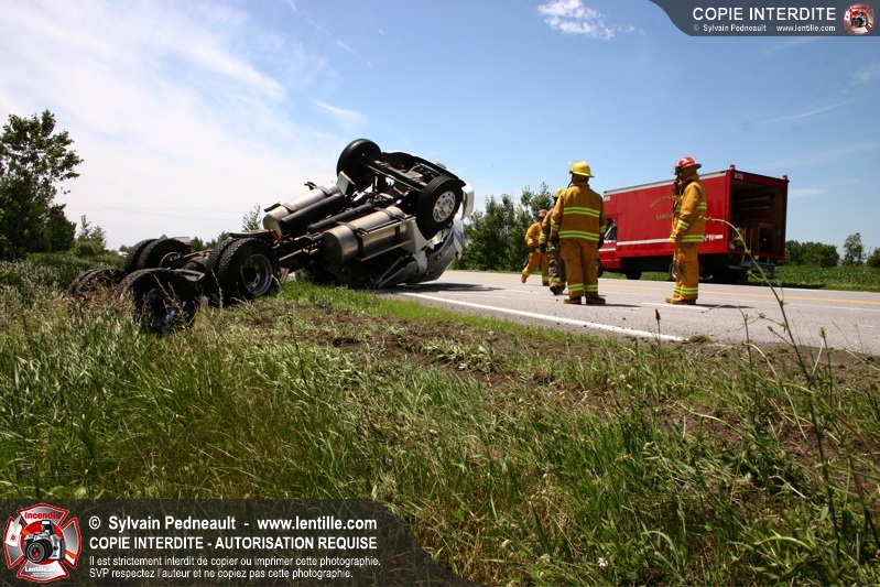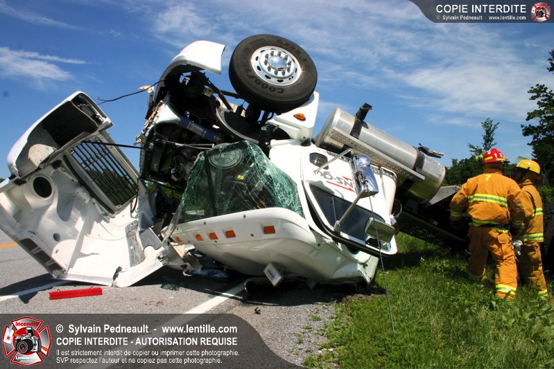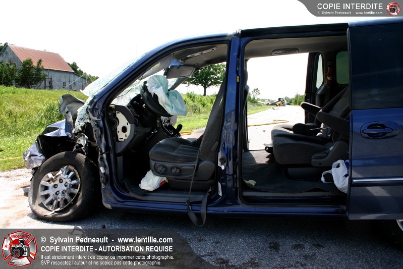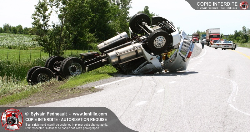 Peu après midi, un camion percute avec force une minifourgonette sur la route 235 à St-Pie. L'impact est si violent que le camion est projeté une centaine de mètres plus loin, à l'envers sur le bord de la route.