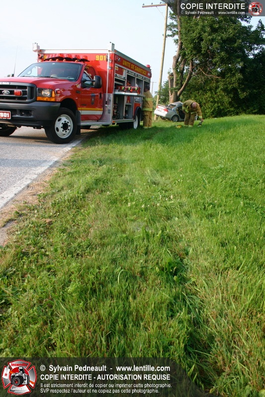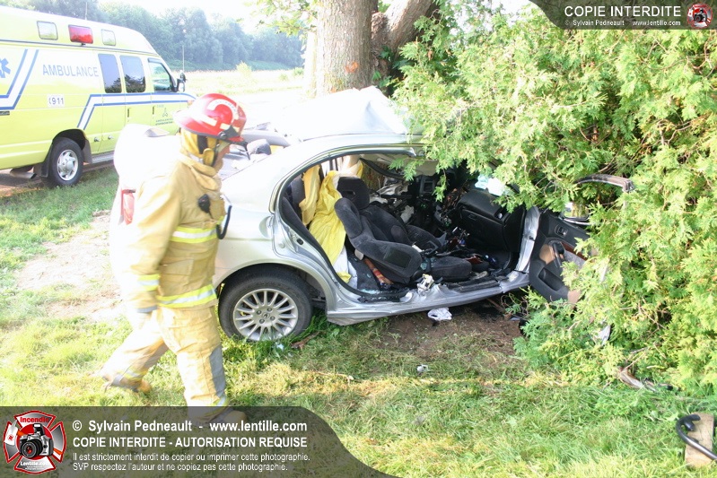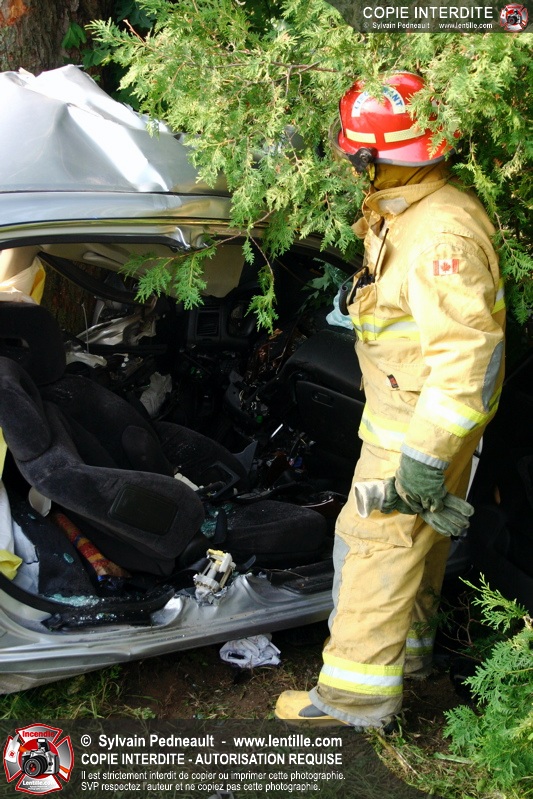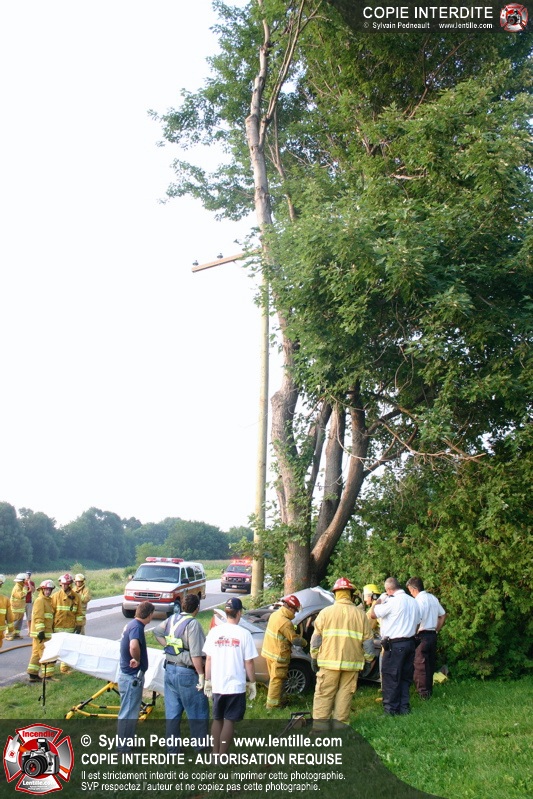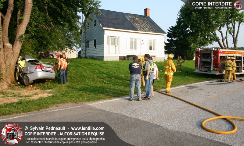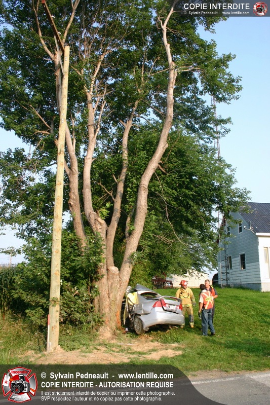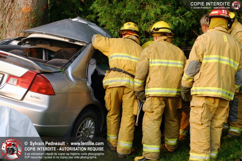 Une voiture a frappé un arbre de plein fouet, ne laissant aucune chance à son conducteur. Les pompiers de St-Pie et l'équipe de sauvetage du service incendie de Saint-Hyacinthe ont effectué la désincarcération.