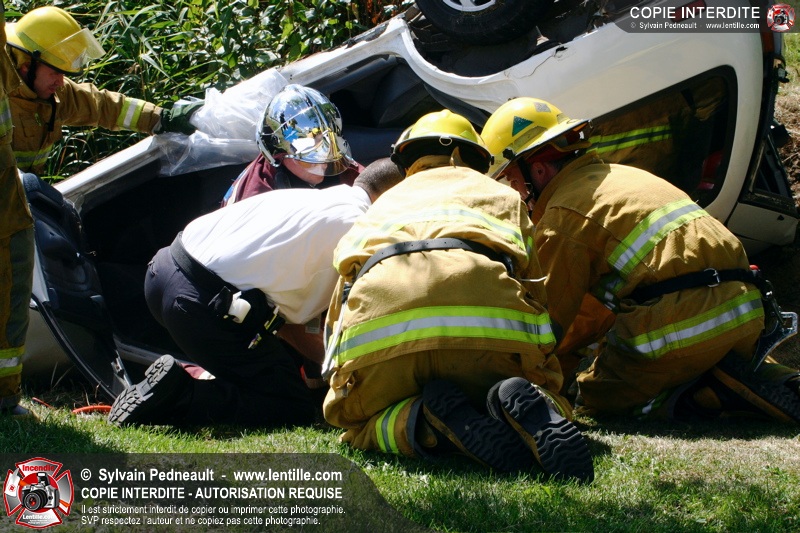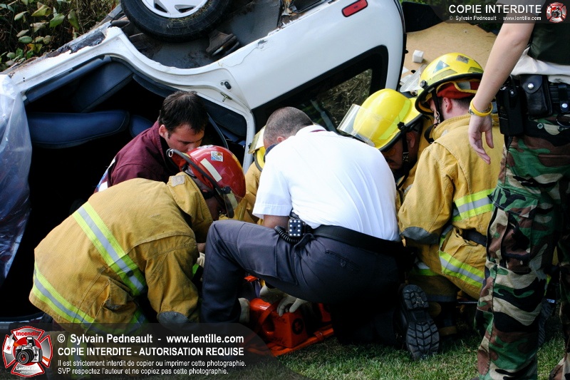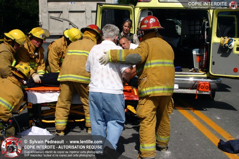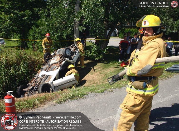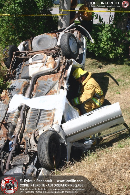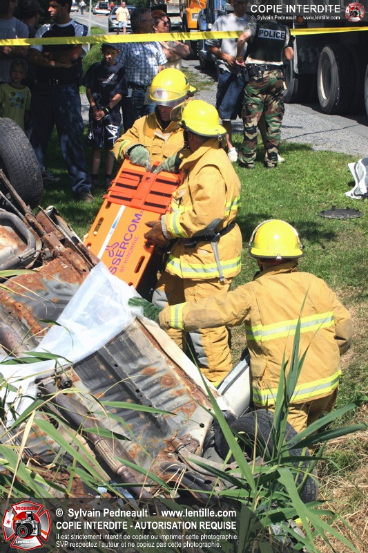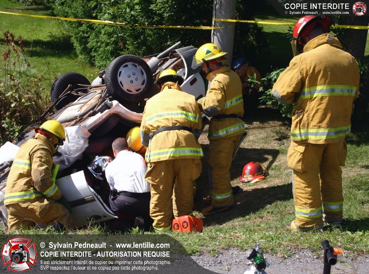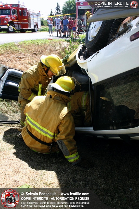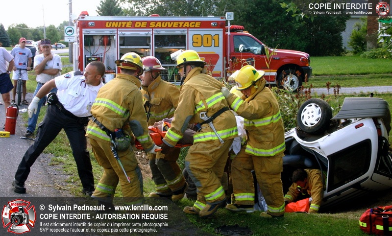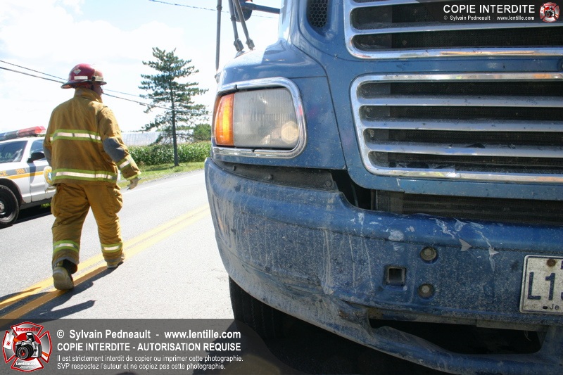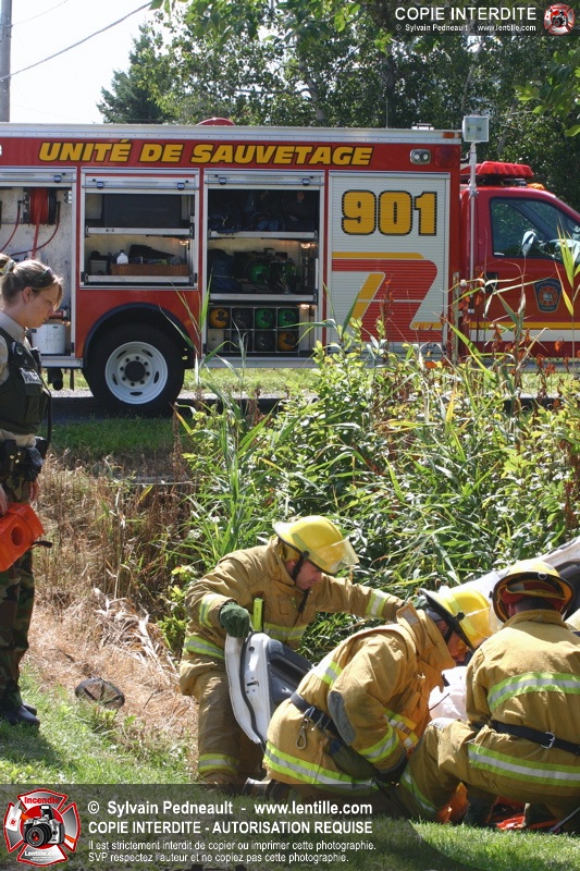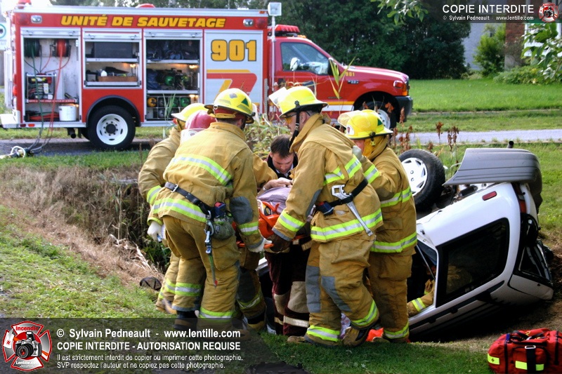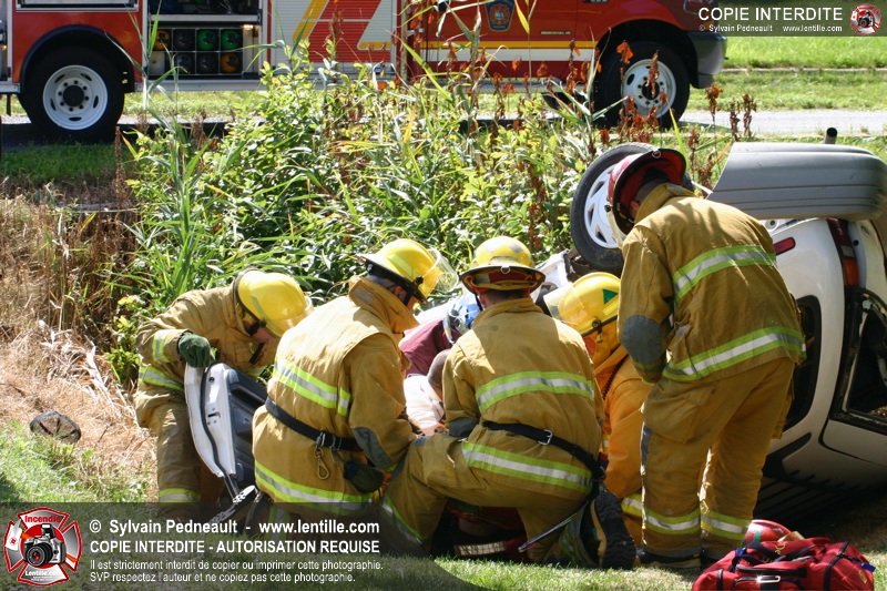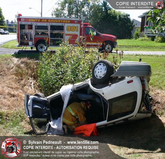Une voiture percutée par un camion a quitté la route et s'est retrouvée à l'envers dans le fossé. Le Service de Sécurité Incendie de Saint-Hyacinthe a effectué la désincarcération.