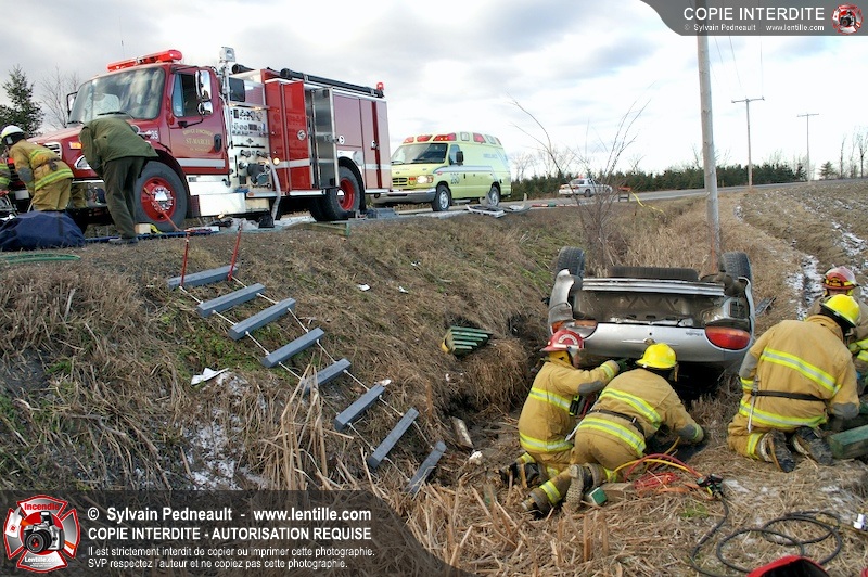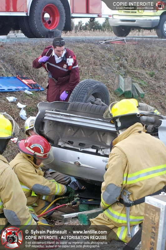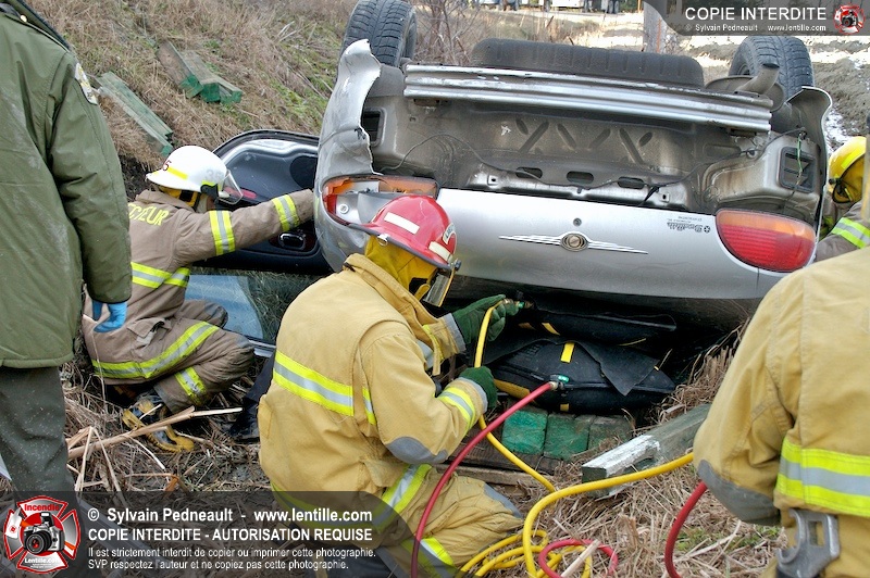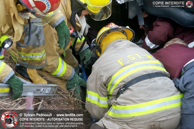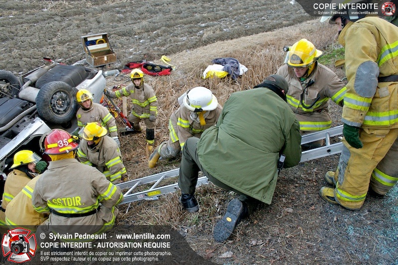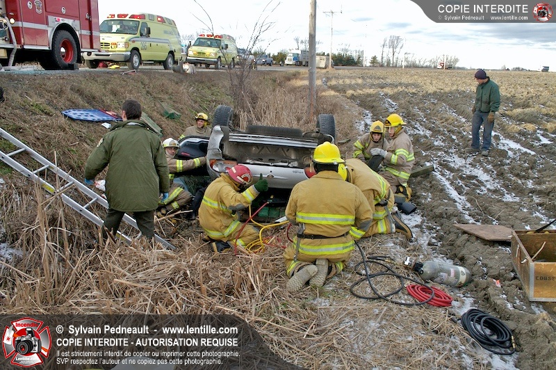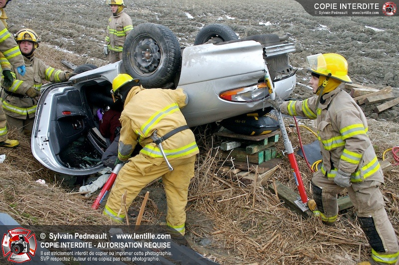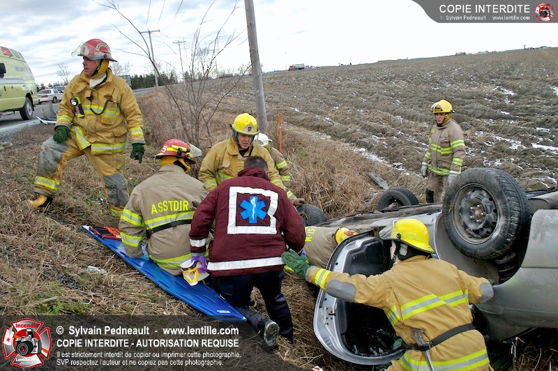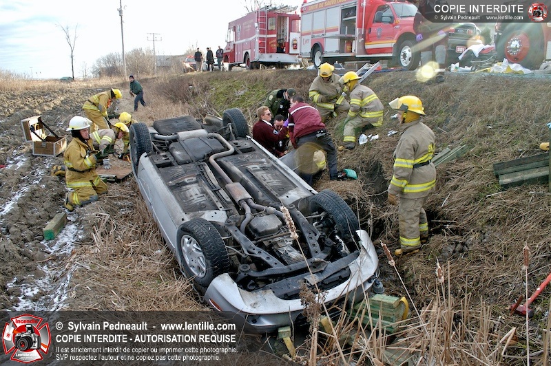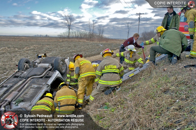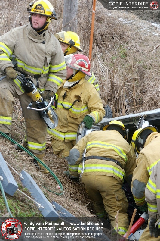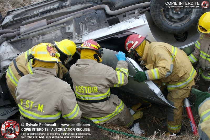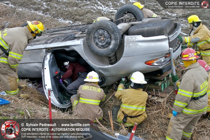 Une complexe opération de désincarcération a eu lieu sur la route 239 près du Rang Ste-Julie à St-Marcel. Puisque le véhicule était renversé sur le toit et qu'il présentait des risques de glissement multi-directionnel pendant les manoeuvres, les pompiers spécialisés du SSI de Saint-Hyacinthe, assistés des pompiers de St-Marcel, ont réalisé la délicate désincarcération de 35 minutes en combinant tout un évantail de techniques et d'équipements.