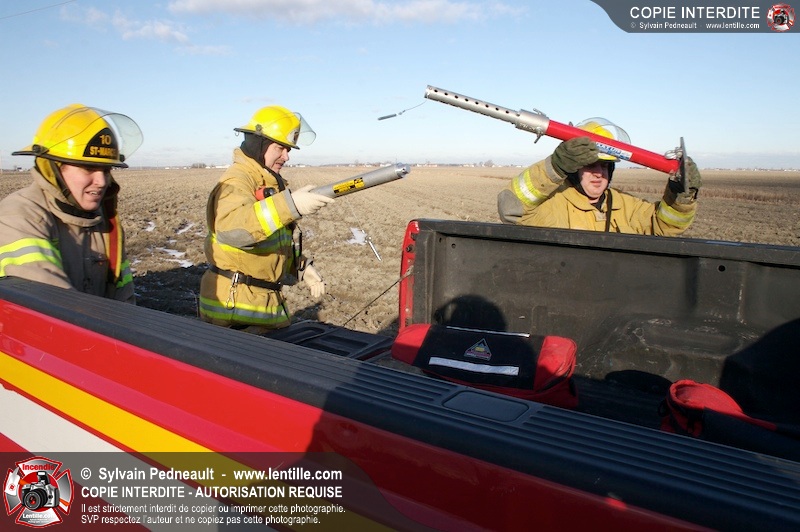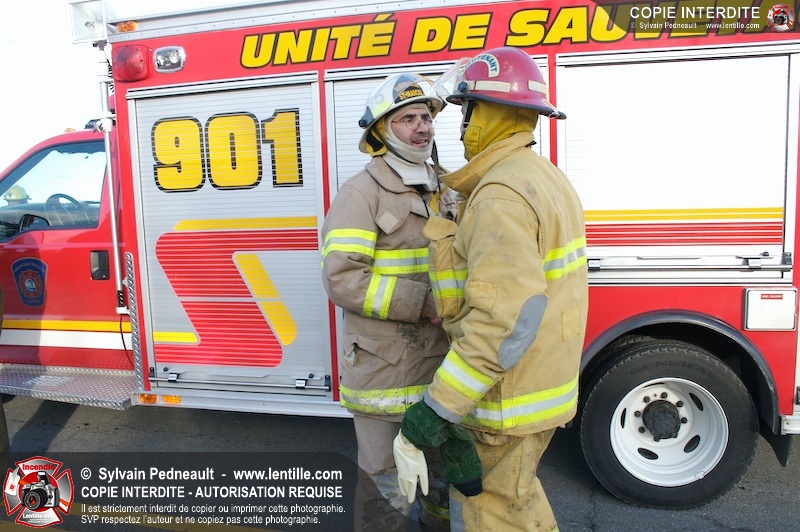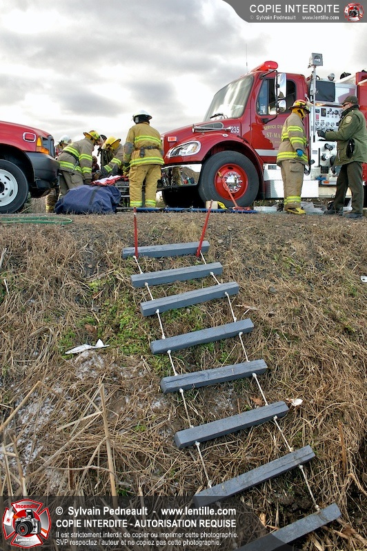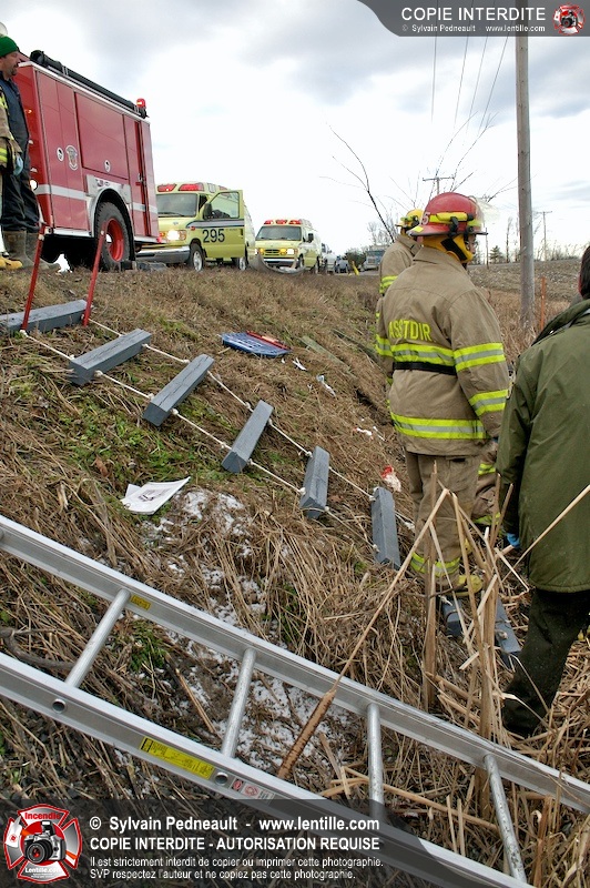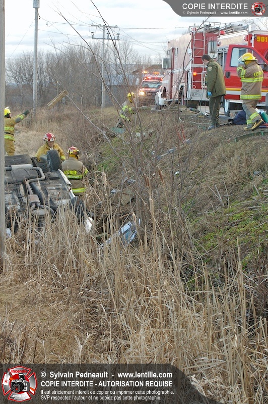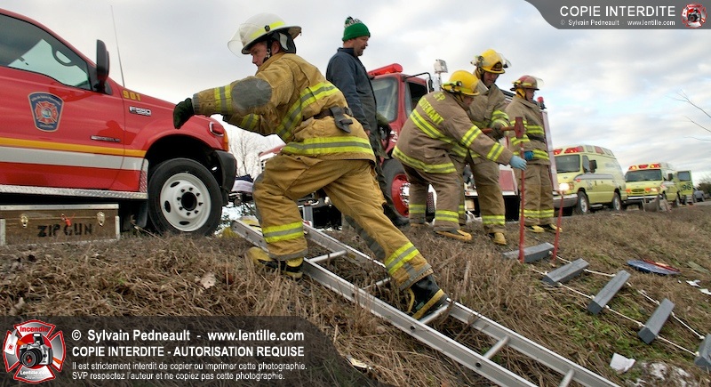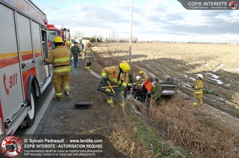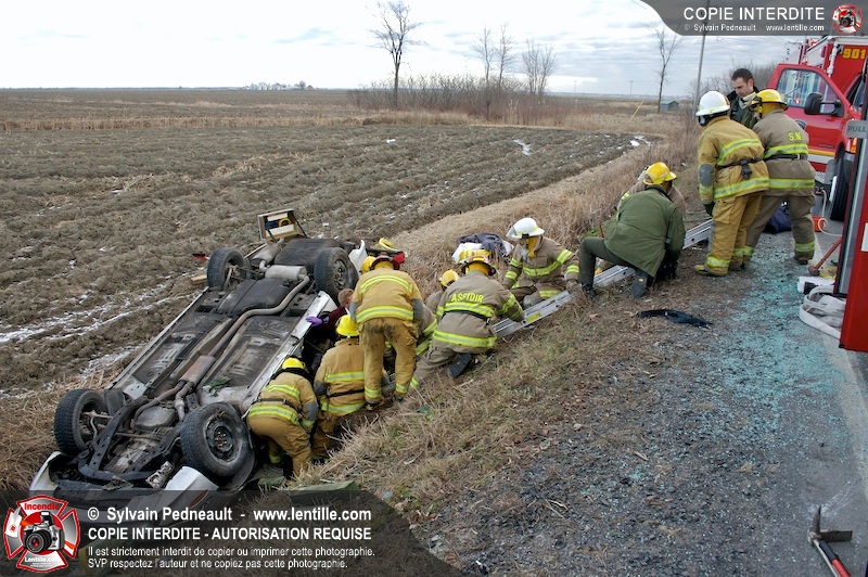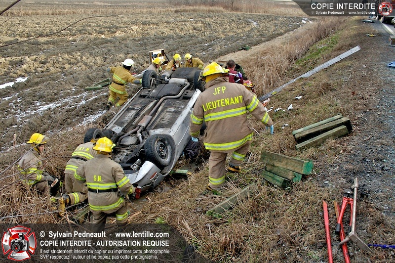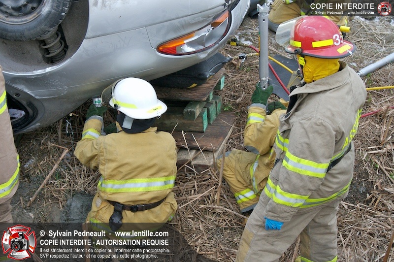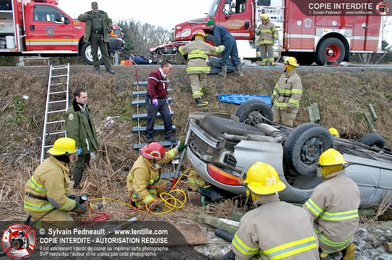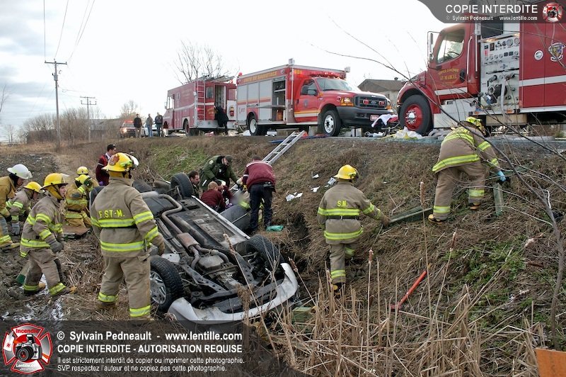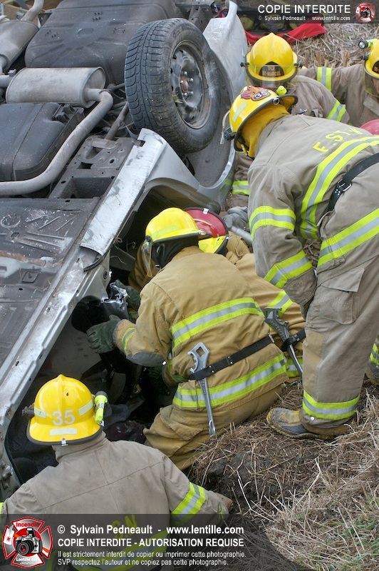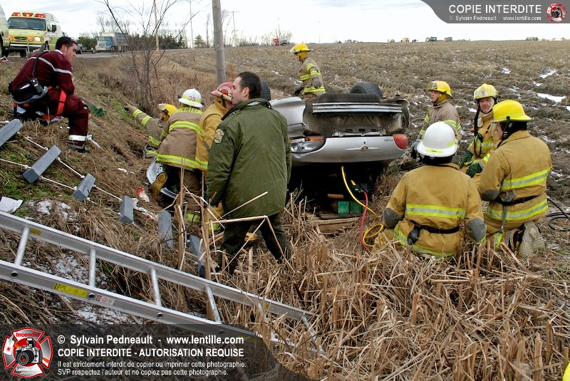 Une complexe opération de désincarcération a eu lieu sur la route 239 près du Rang Ste-Julie à St-Marcel. Puisque le véhicule était renversé sur le toit et qu'il présentait des risques de glissement multi-directionnel pendant les manoeuvres, les pompiers spécialisés du SSI de Saint-Hyacinthe, assistés des pompiers de St-Marcel, ont réalisé la délicate désincarcération de 35 minutes en combinant tout un évantail de techniques et d'équipements.