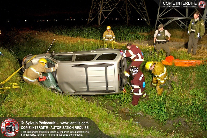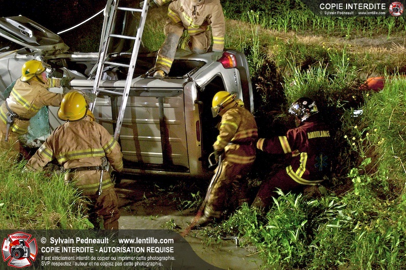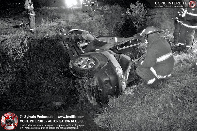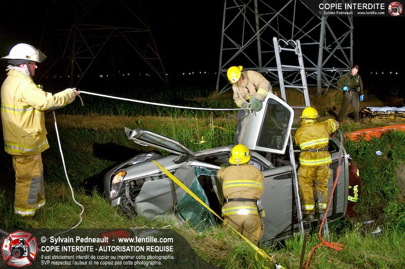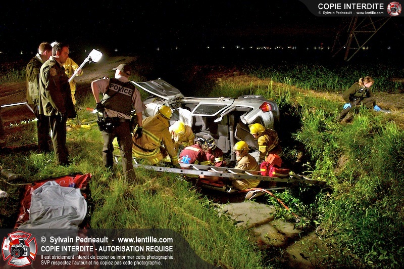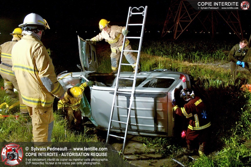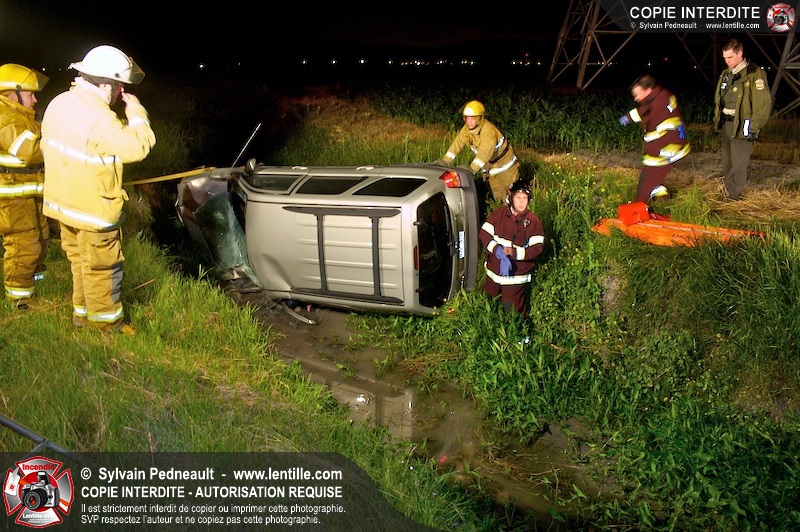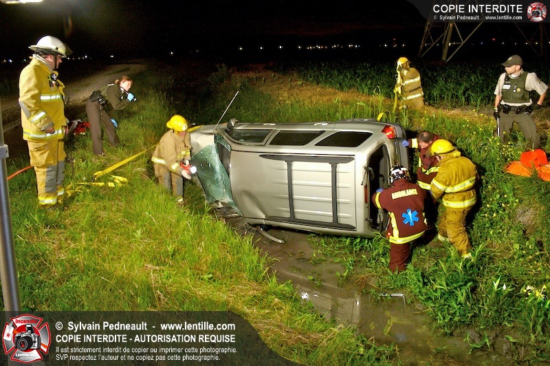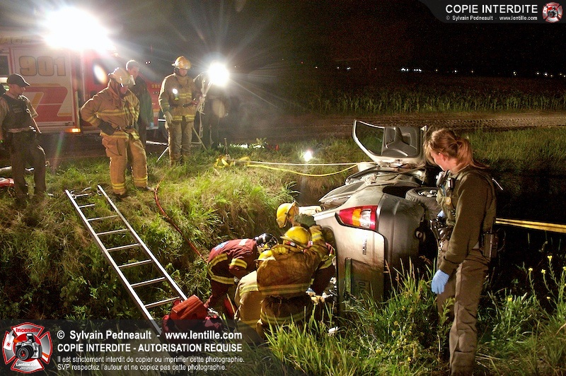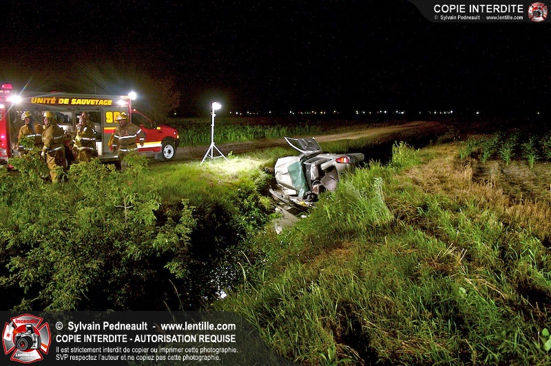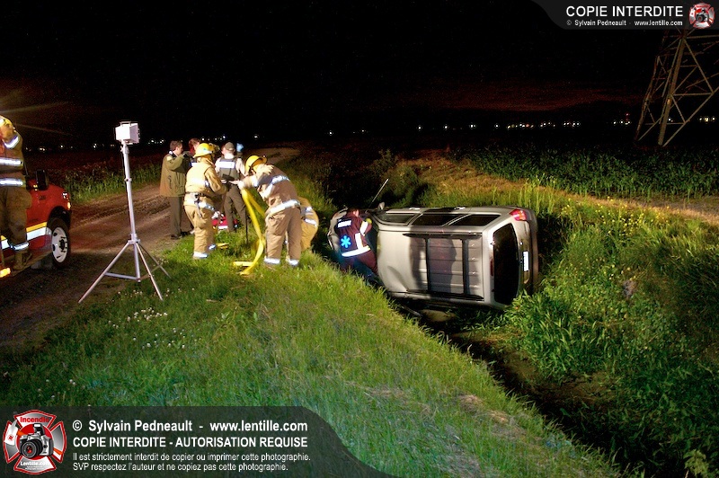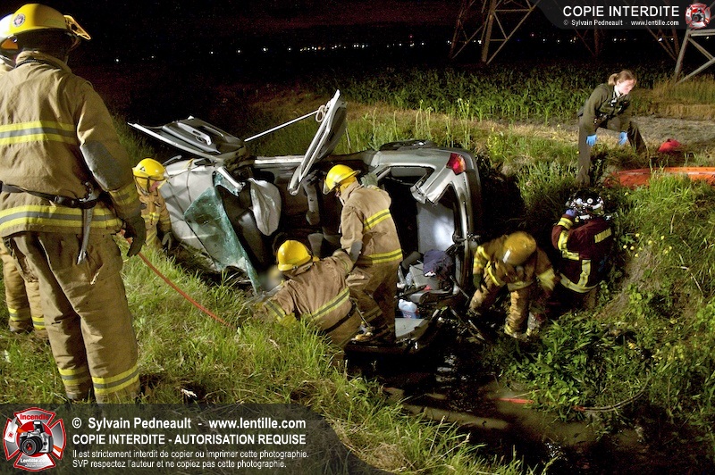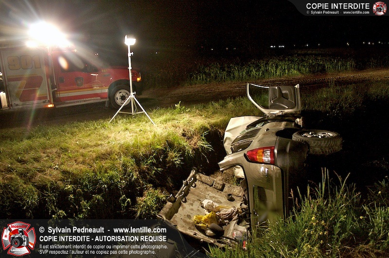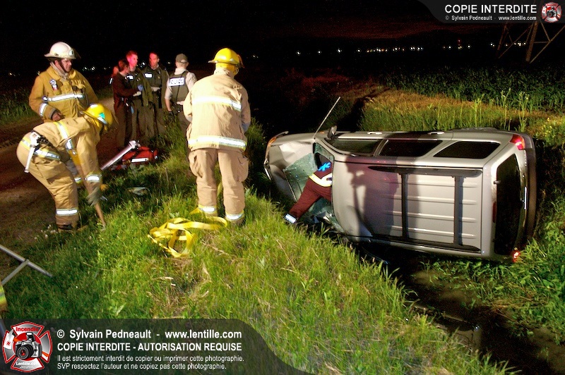 Pour une raison encore inconnue, un homme dans un VUS a poursuivi sa course au delà de l'extrémité du 4e Rang, résultant en un violent accident dans le fond d'un fossé. L'unité de désincarcération du SSI de Saint-Hyacinthe, les paramédics de Saint-Hyacinthe et les policiers de la Sûreté du Québec ont répondu à cet appel.