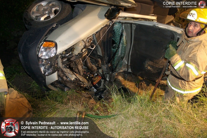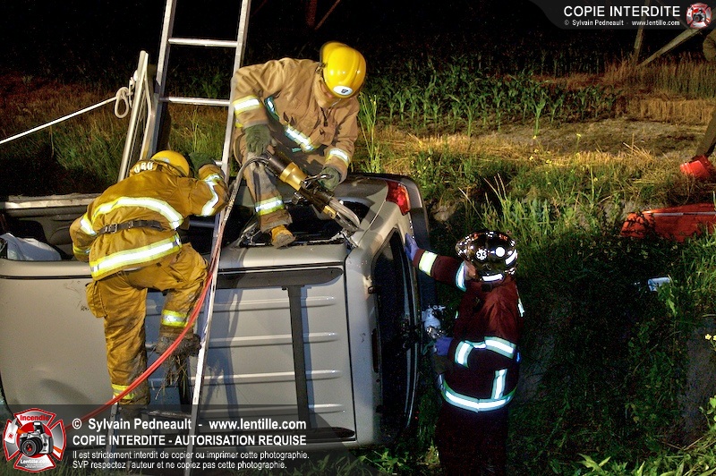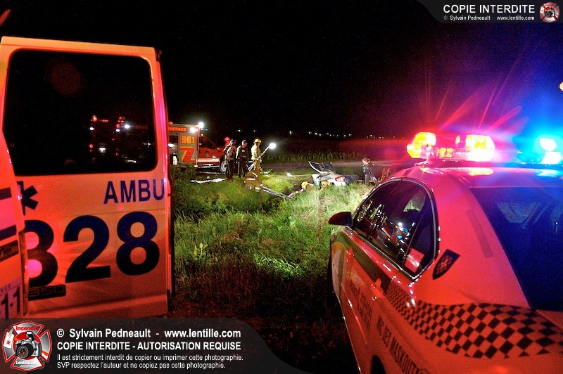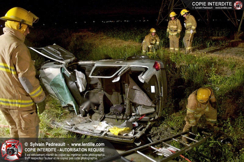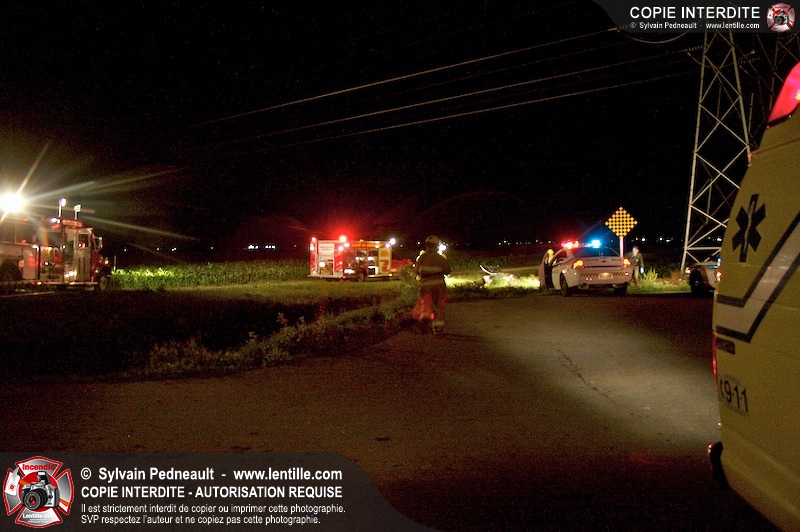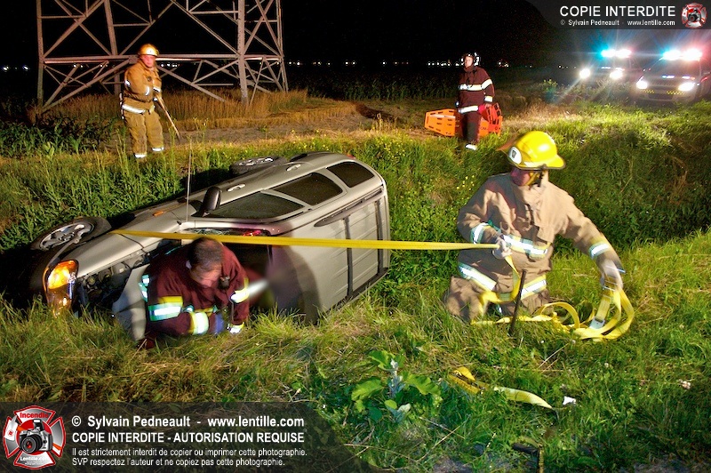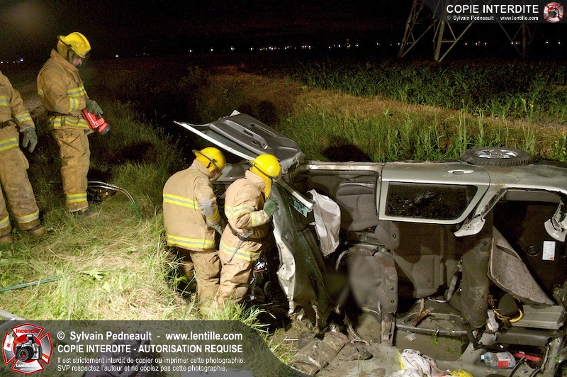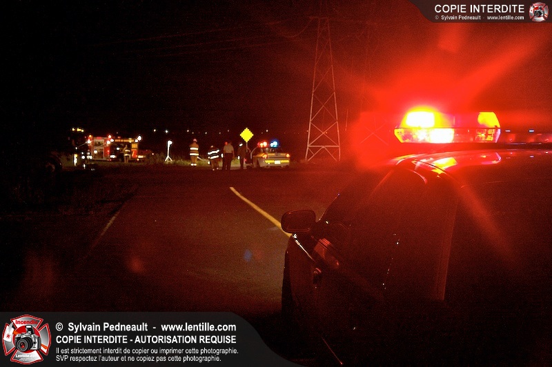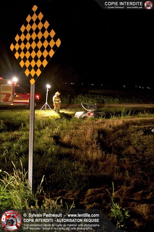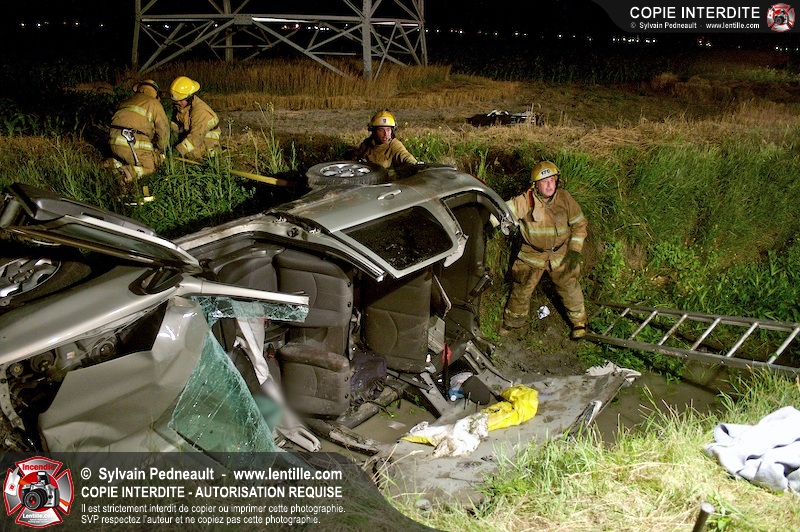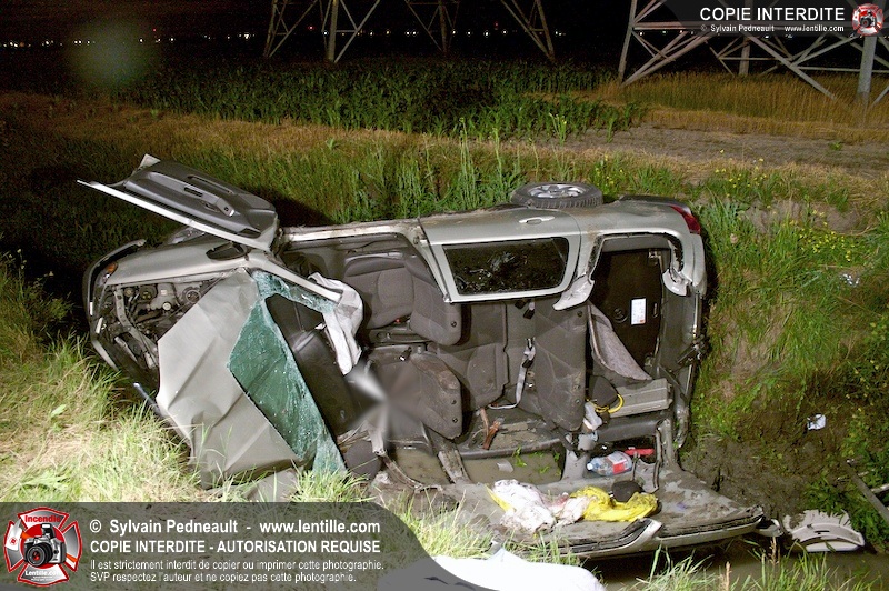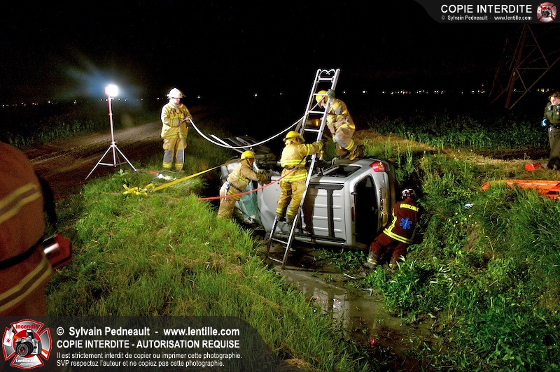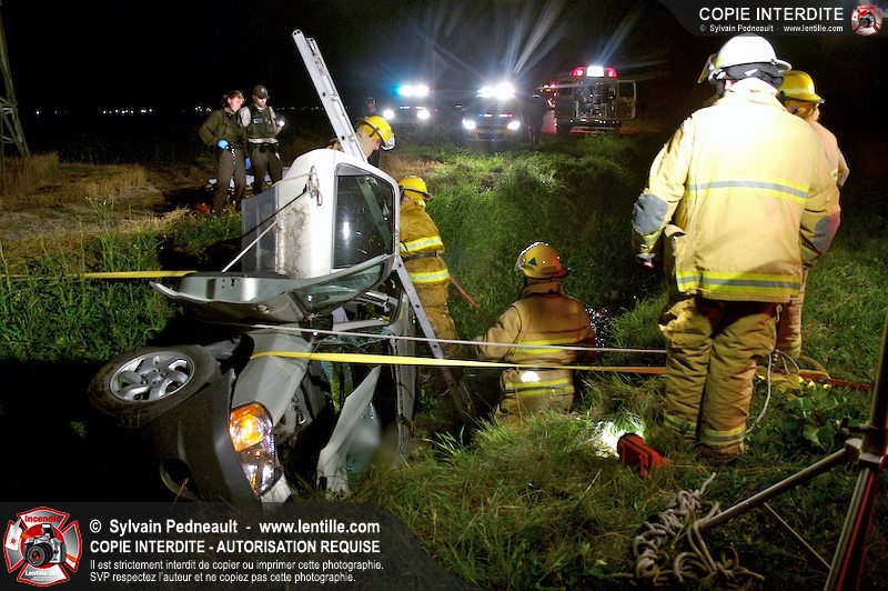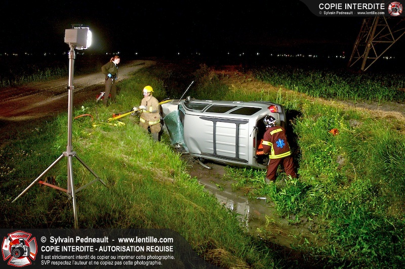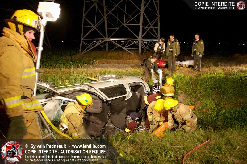 Pour une raison encore inconnue, un homme dans un VUS a poursuivi sa course au delà de l'extrémité du 4e Rang, résultant en un violent accident dans le fond d'un fossé. L'unité de désincarcération du SSI de Saint-Hyacinthe, les paramédics de Saint-Hyacinthe et les policiers de la Sûreté du Québec ont répondu à cet appel.