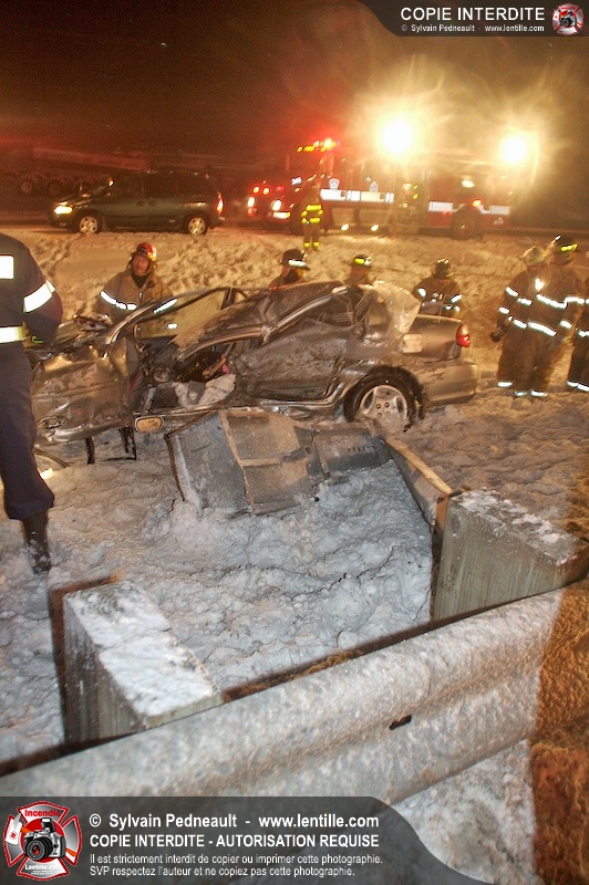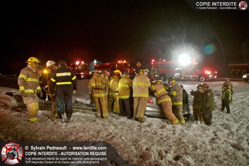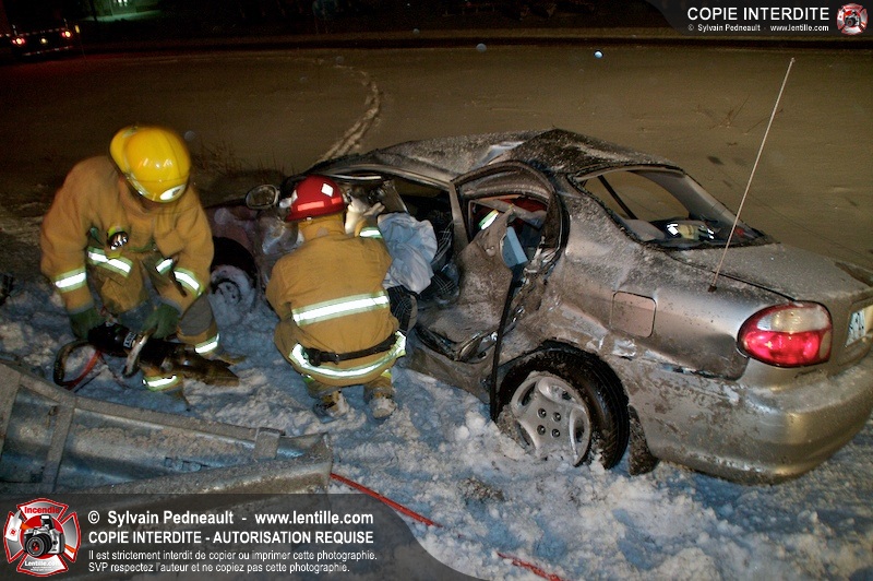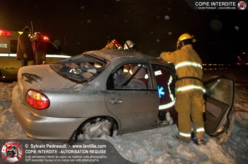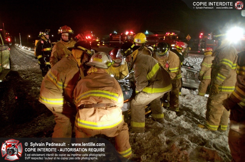 Les pompiers du Service de sécurité incendie de Saint-Hyacinthe ont dû mettre en oeuvre deux unités de désincarcération simultanément pour libérer une conductrice incarcérée dans son véhicule. Les pompiers de St-Simon ont assuré la protection incendie et assisté les intervenants en désincarcération. Les paramédics de Saint-Hyacinthe sont intervenus dans le véhicule accidenté pendant toute la durée des opérations, et ont ensuite transporté la victime au centre hospitalier.