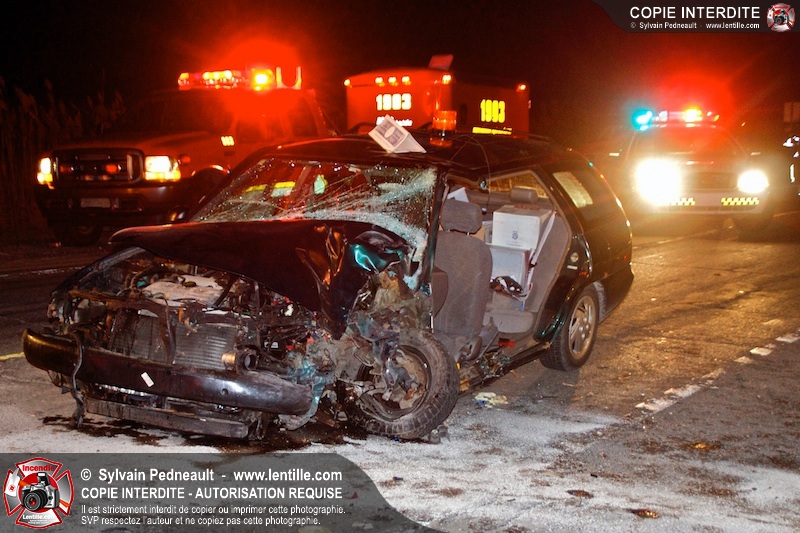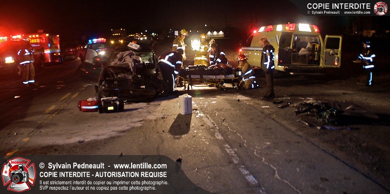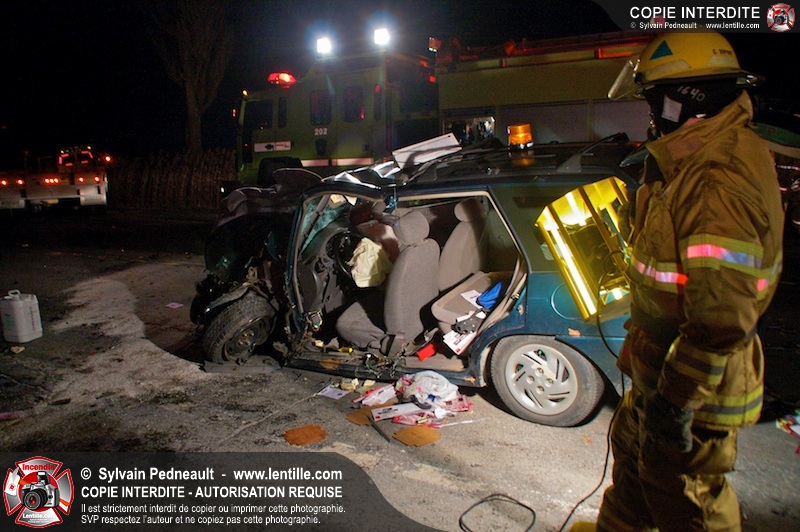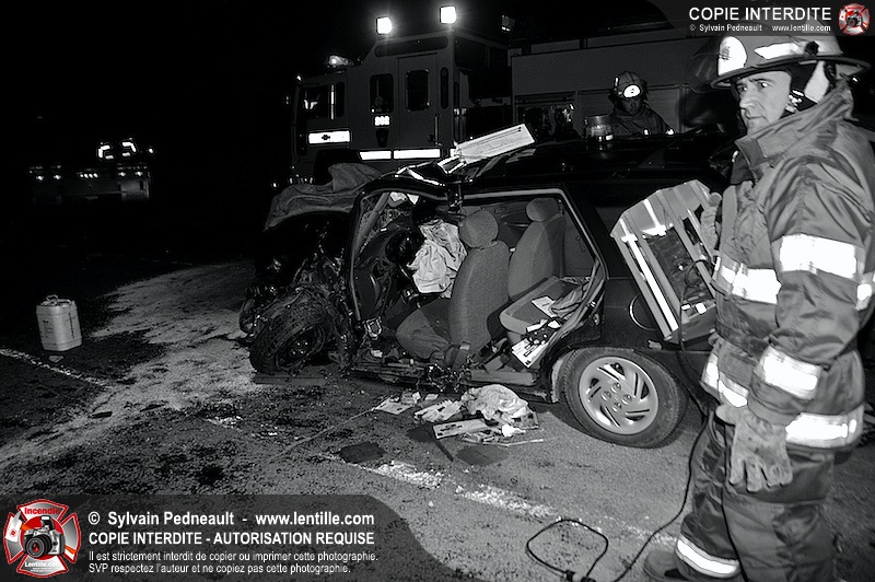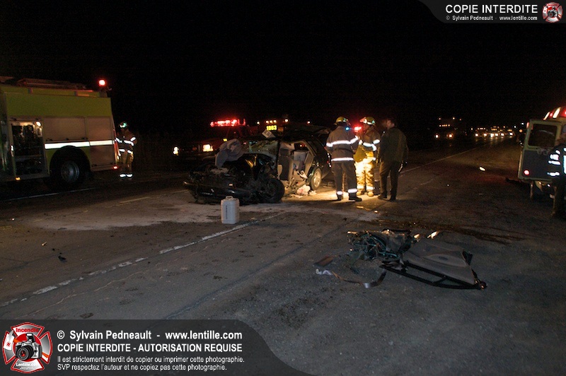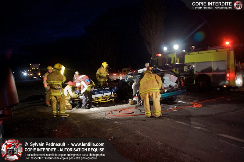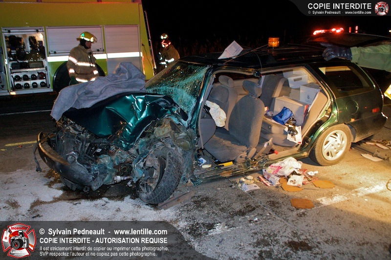 Une violente collision entre une automobile et un camion a entraîné la mobilisation d'unités du Service de sécurité incendie de la Ville de Saint-Hyacinthe, des paramédics de Saint-Hyacinthe et de la Sûreté du Québec.